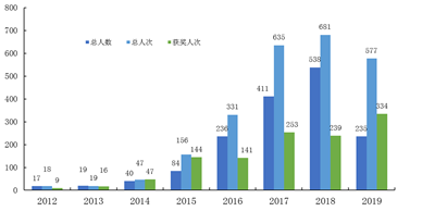 计算机科学与工程学院2012-2019年参加全国省市校竞赛人数统计