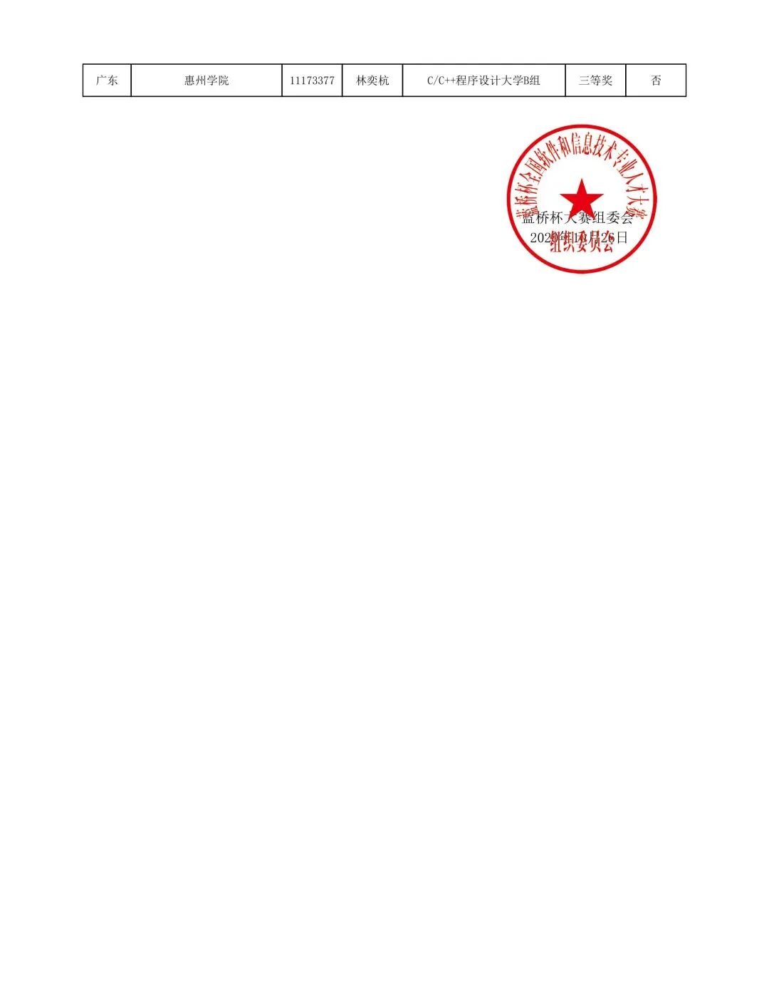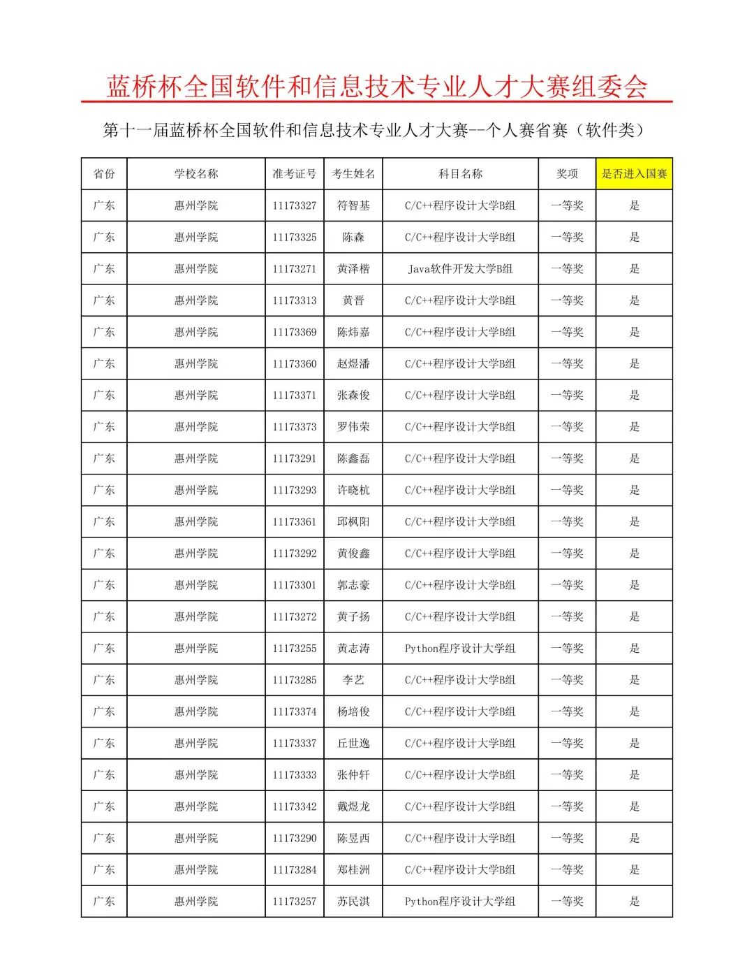 10月26日,第十一届“蓝桥杯”全国软件和信息技术专业人才大赛省赛获奖名单公布。惠州学院共有120人参赛,其中计算机科学与工程学院有119人参赛。我校最终获奖人数108人,其中,获得一等奖31人、二等奖53人、三等奖24人。经计算机科学与工程学院学科竞赛委员会讨论,决定推举获得一等奖的31位学生和陈捷新同学共32人参加11月14日举行的全国总决赛。