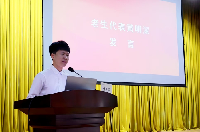 老生代表、23级网络空间安全专业黄明深同学以“挑战、接纳、热爱、责任”四个关键词概括自己大学以来的成长经历和心得感悟,鼓励新生在大学里勇敢挑战自我,学会接纳挫折,找到心中热爱,肩负起责任。新生代表、2025级计算机3班陈冠旭同学表达自己对计算机专业的热爱与对未来发展的美好憧憬。他分享了自己大学四年的规划并倡议同学们要肩负起时代的重任,将小我融入大我,书写青春华章。