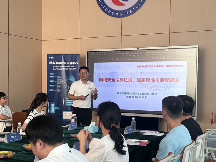 在交流会上,惠州市计算机学会常务副理事长、我院副院长汪华斌副教授以“网络安全法律法规、国家标准与网络专业课程建设”为主题作了分享。他对当下网络安全领域的核心法律法规与国家标准开展了系统阐释,并结合高校网络安全专业课程建设的实际状况,提出了将网络安全法律法规、国家标准融入网络安全安全专业课程思政教学的具体举措,为高校培育知法守法、符合行业需求的网络安全人才提供了培养思路。随后,与会教师围绕这一理念展开研讨,结合自身教学实践,共同探究如何在专业课程中融入国家法律法规等思政元素,以达成价值引领,切实提高学生的职业素养与社会责任感的目标。