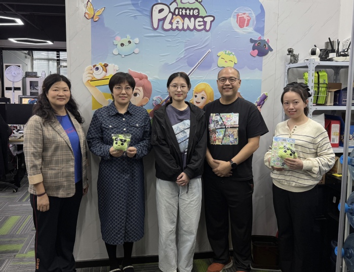 张晓欢一行首先亲切慰问了实习学生,随后与黄庄总经理开展了深入沟通,了解了该公司的创办历程、主营业务、发展前景以及当前正在运营中的典型案例项目。黄庄总经理表示,脑穿越科技有限公司作为深耕XR赛道10年的小型高新技术企业,目前已将数个相对成熟的项目推向市场,其中尤为出色的Little Planet(小小星球)VR游戏的全球注册用户已超10万,其周边纪念品也已与游戏一同上线。